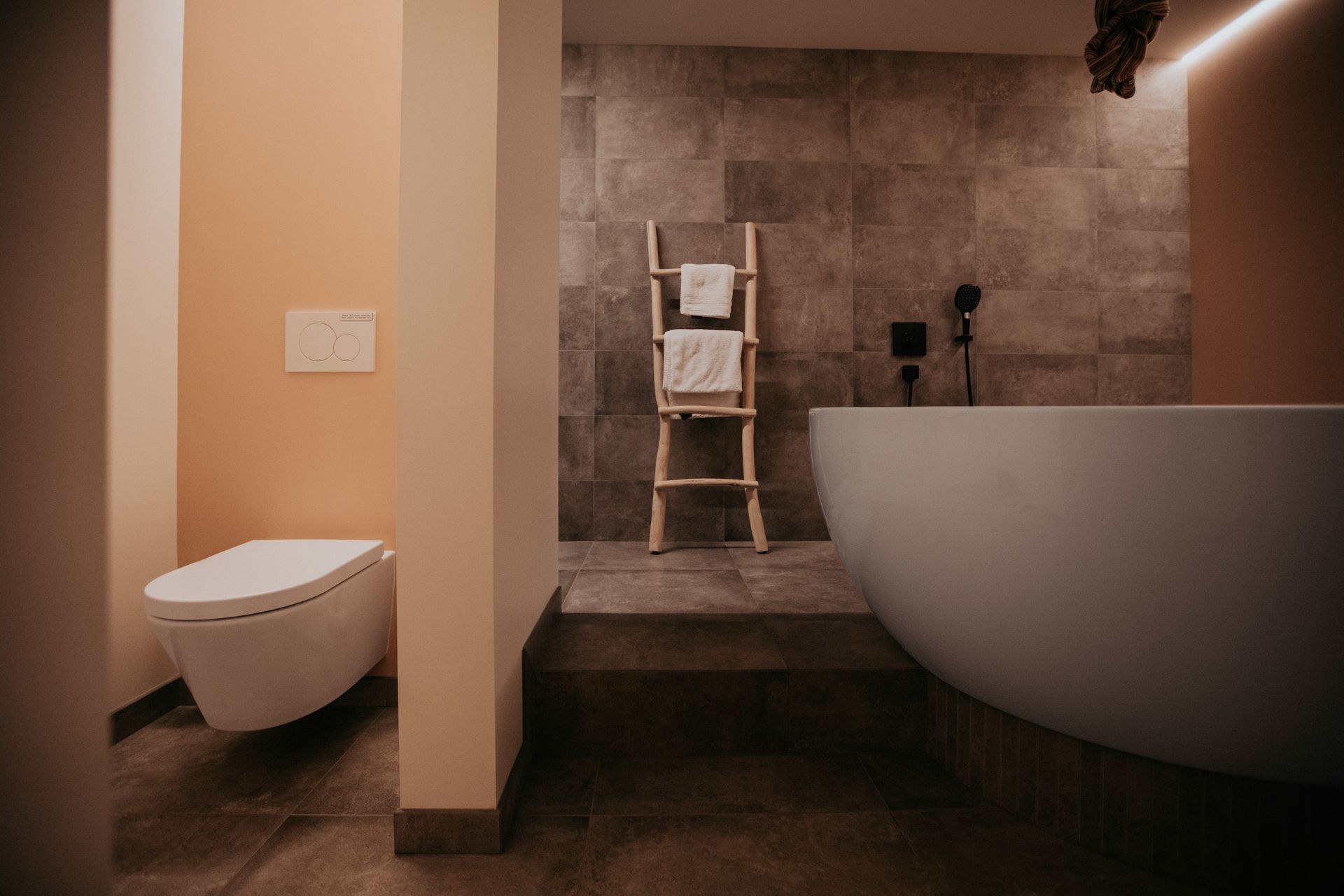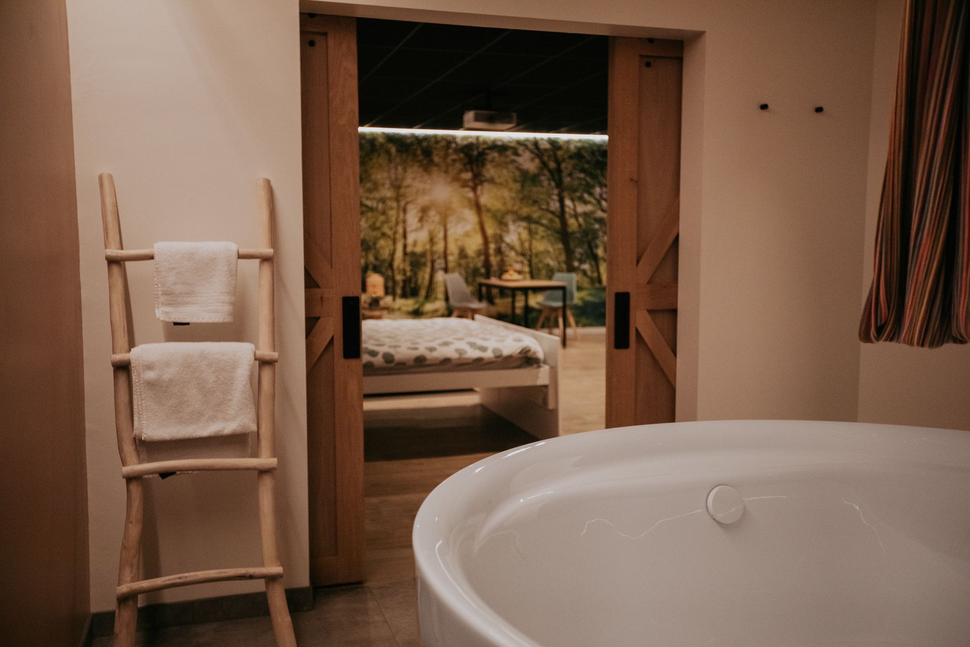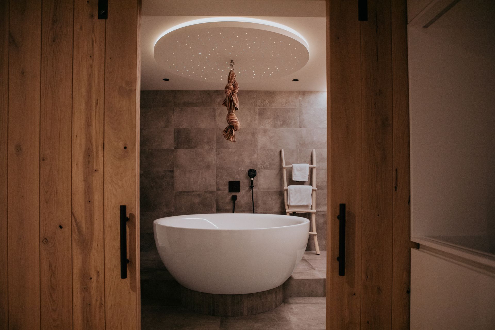 Achter de eiken schuifdeuren wacht een badkamer met een rond bad onder een sterrenhemel. Hier kan je ontspannen tijdens de arbeid of kiezen voor een badgeboorte. Er is ook een ruime inloopdouche en toilet.