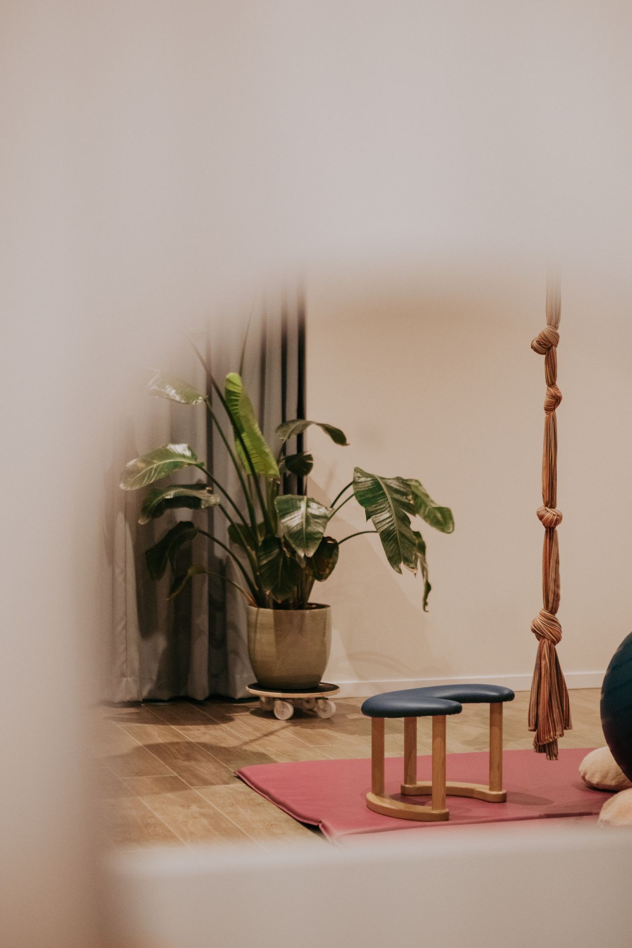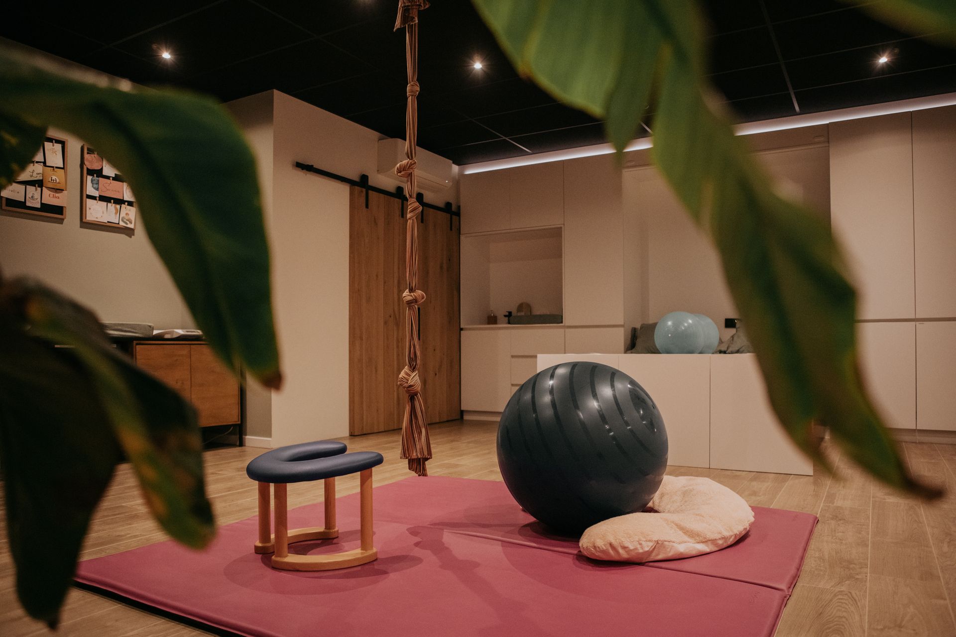 Je komt binnen via een aparte ingang, met parkeergelegenheid vlakbij. Binnen wacht een warme ruimte met alles wat je nodig hebt: een zetel, een peanutbal, een baarkruk, een mat, touwen aan het plafond en een tweepersoonsbed dat uit de kast tevoorschijn komt. Alles nodigt uit tot bewegen, rusten, voelen en kiezen.