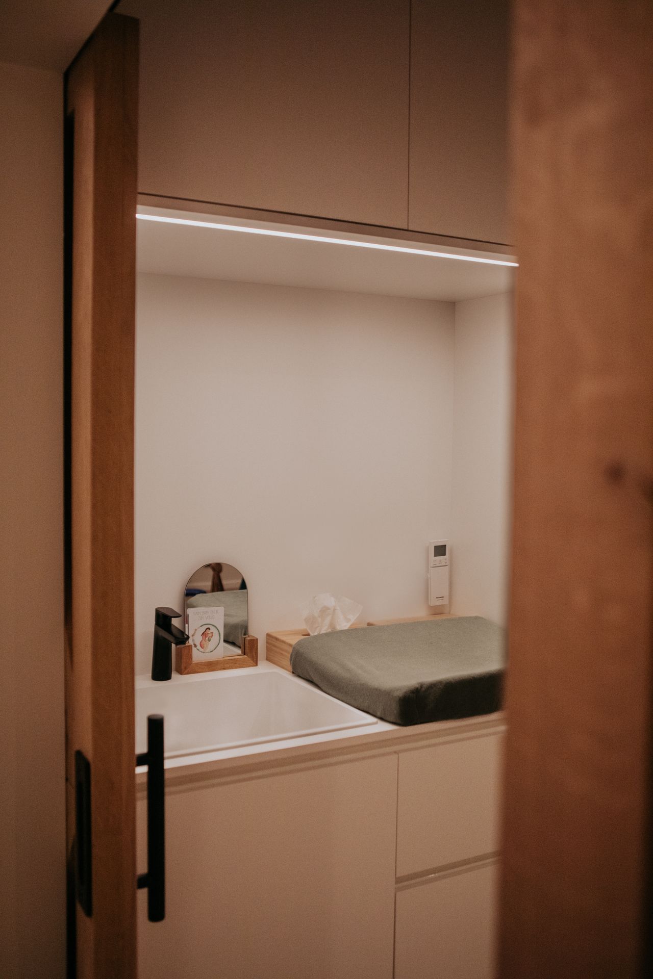 De sfeer is zacht en geborgen. Een natuurfotowand, een donker plafond en indirecte verlichting zorgen voor een cocon waarin je mag landen. Waar je mag loslaten. Waar je mag geboren worden.