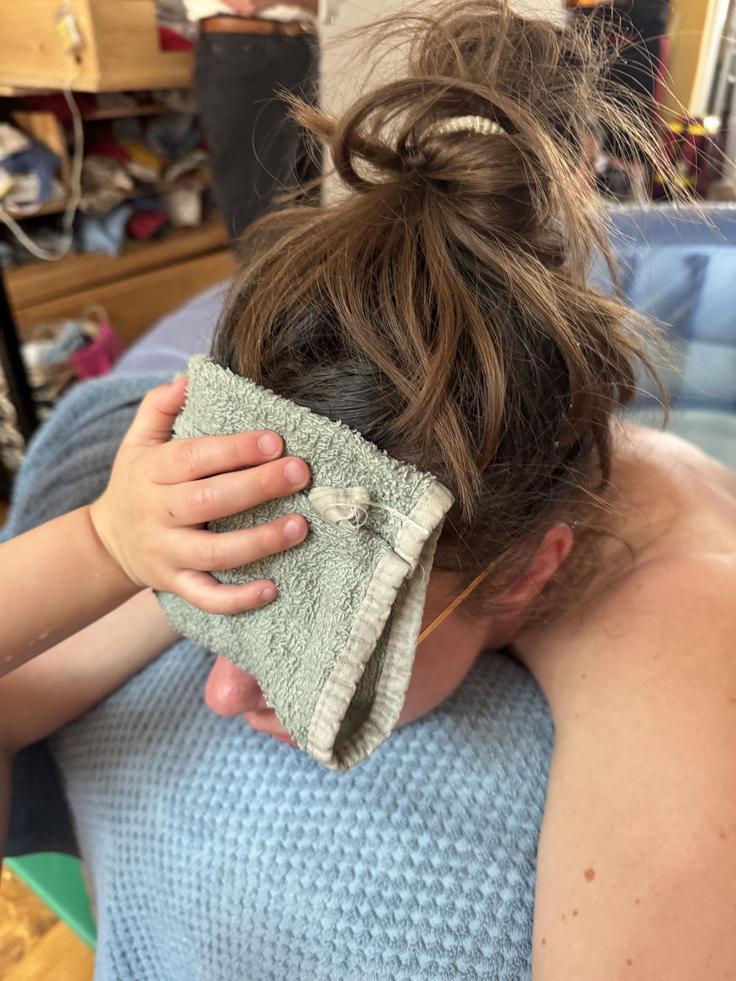 Ik voelde een enorme druk naar beneden achter en plots zei Rosanne dat ze haartjes zag, ik dacht ‘HAARTJES, HIJ HEEFT HAARTJES, IK WIL HEM ZIEN’, maar voelde geen persdrang, eerder een drang om oerkreten te roepen. Ik wilde ook niet teveel duwen, want wou mijn vagina de tijd geven om zich te ontvouwen tot een bloem.